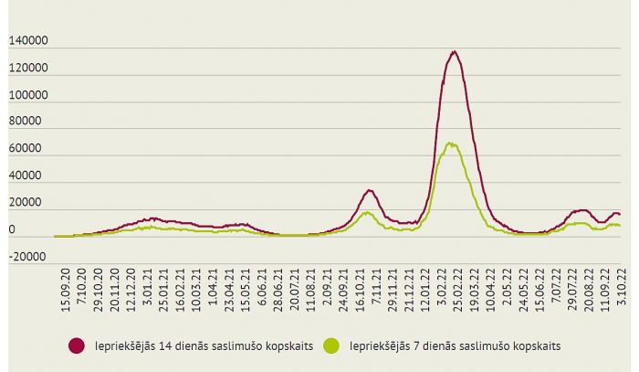 Aizvadītajā nedēļā – no 26.septembra līdz 2.oktobrim – par 7,7% samazinājies jaunatklāto Covid-19 gadījumu skaits, taču par 32% pieaudzis pacientu skaits stacionāros.