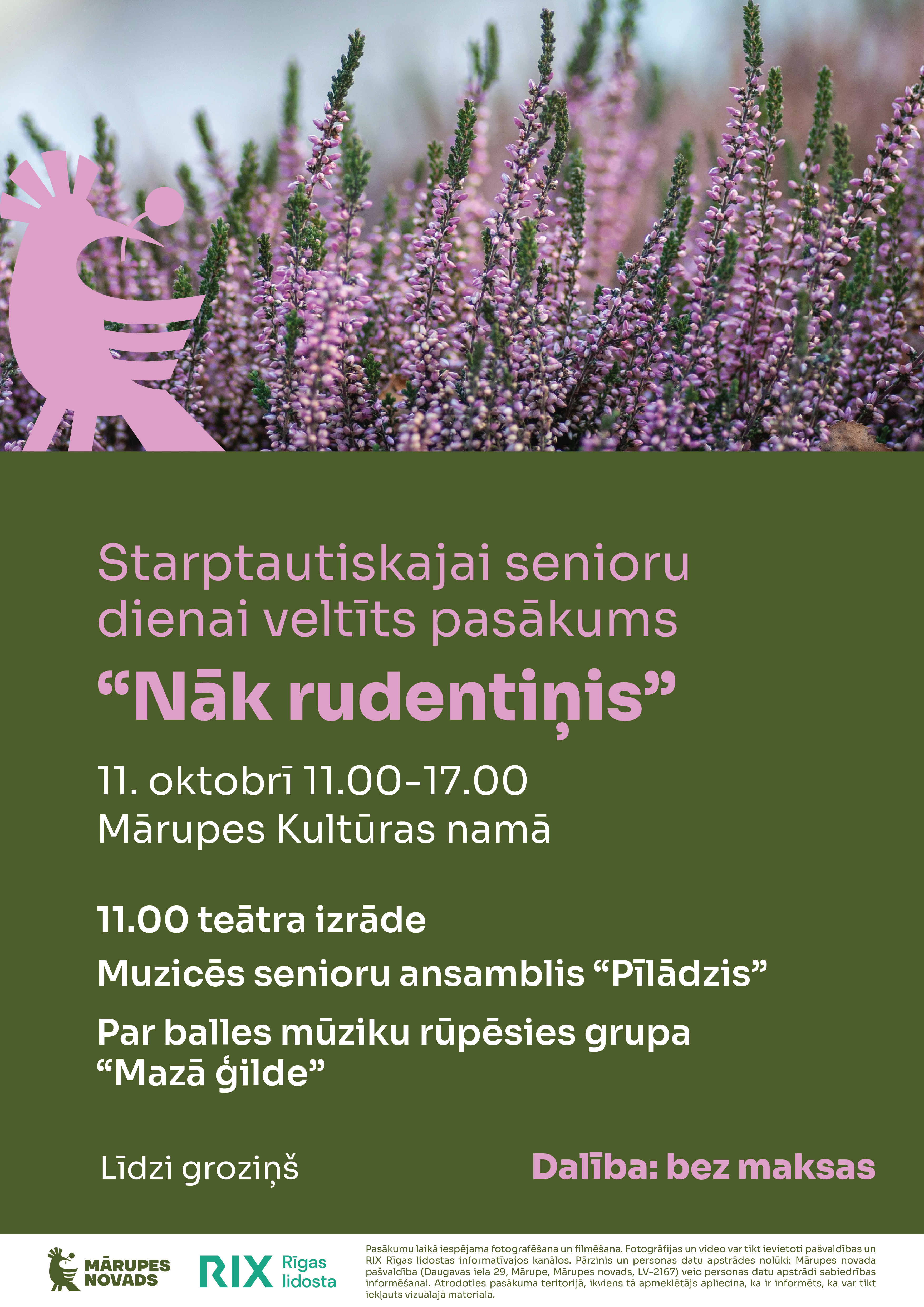 11.oktobrī plkst.11.00 Mārupes Kultūras namā notiks senioru dienai veltīts pasākums “Nāk rudentiņis”. Muzicēs senioru ansamblis "Pīlādzis". Par balles mūziku rūpēsies grupa "Mazā ģilde".