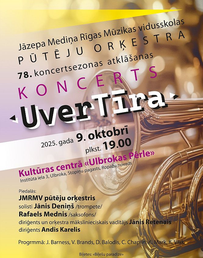 9.oktobrī plkst.19.00 Kultūras centrā “Ulbrokas pērle” paredzēts Jāzepa Mediņa Rīgas Mūzikas vidusskolas pūtēju orķestra koncerts "UverTīra". Koncerta nosaukums sevī slēpj divus svarīgus atslēgas vārdus: ‘Uvertīra’, kas ieskandinās Jāzepa Mediņa Rīgas Mūzikas vidusskolas tuvojošos simtgadi, un ‘Tīra’, jo katrs gads pūtēju orķestra dzīvē sākas kā balta, tīra lapa, kuru visa mācību gada laikā mēs piepildām ar dažādiem nošurakstiem un koncertprogrammām. Koncertā skanēs oriģināldarbi pūtēju orķestrim, kas kļuvuši par pūtēju orķestru klasiku, kā arī aizraujošākie jaunlaiku skaņdarbi no viegli izklaidējoša repertuāra.