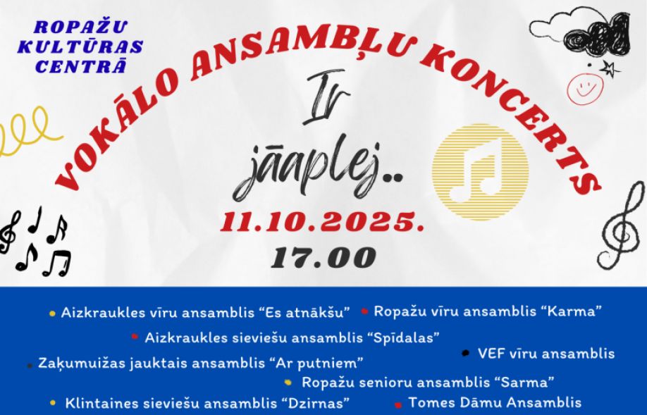 11.oktobrī plkst.17.00 Ropažu Kultūras centrā notiks vokālo ansambļu sadraudzības koncerts “Ir jāaplej”, kurā piedalīsies Aizkraukles vīru ansamblis "Es atnākšu", Aizkraukles sieviešu ansamblis "Spīdalas", Klintaines sieviešu ansamblis “Dzirnas”, Tomes Dāmu ansamblis, VEF vīru ansamblis, Zaķumuižas jauktais ansamblis “Ar putniem”, Ropažu senioru ansamblis "Sarma", Ropažu vīru ansamblis "Karma". Ieeja bez maksas.