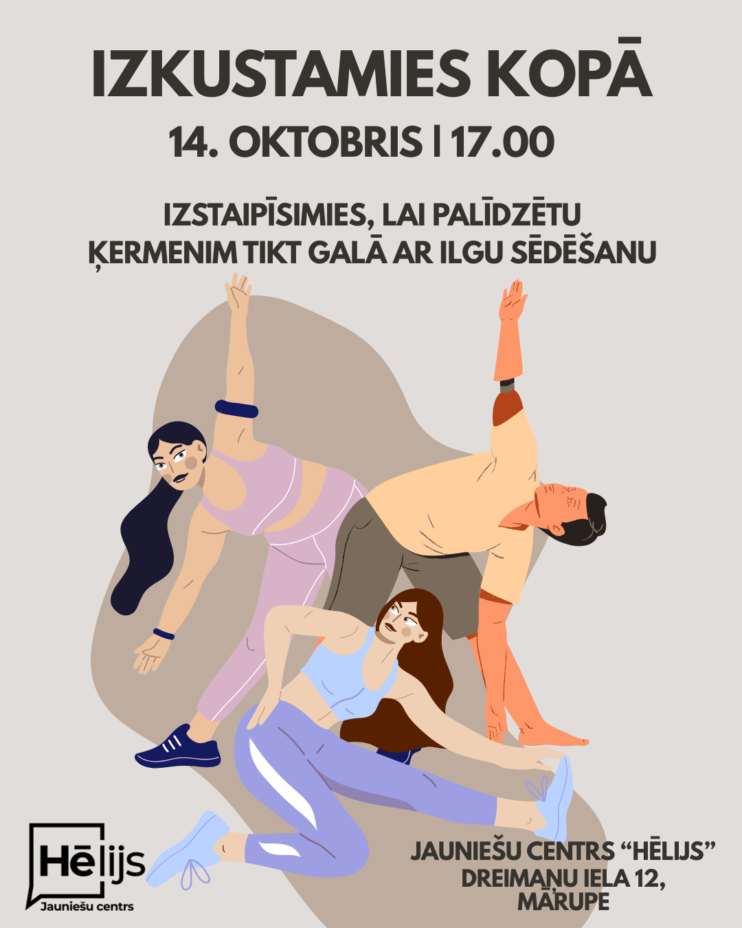 14.oktobrī plkst.17.00 jauniešu centrā “Hēlijs” Mārupē notiks pasākums “Izkustamies kopā!”. Sākoties vēsākam laikam, paši nemanot mēdzam kļūt neaktīvi. Pēc skolas gribas ieritināties pledā un nemaz nedomāt par pastaigu svaigā gaisā vai izstaipīšanos pēc garas dienas. Tomēr mēs zinām, cik svarīga ir kustība gan fiziskajai, gan mentālajai veselībai. Tieši tāpēc nāc uz “Hēliju”, kur Elīza parādīs, kā savam ķermenim justies labāk pēc garas dienas!