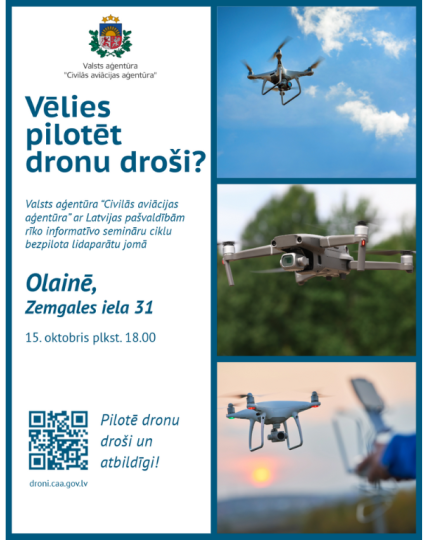 15.oktobrī plkst.18.00 Pieaugušo izglītības centrā Olainē notiks valsts aģentūras “Civilās aviācijas aģentūra” informatīvais seminārs par bezpilota lidaparātu (dronu) izmantošanu. Semināra laikā tiks sniegta informācija par spēkā esošajām normatīvā regulējuma prasībām un lietotāju pienākumiem, lai nodrošinātu drošu un tiesisku lidojumu. Pēc semināra būs iespēja kārtot teorētisko eksāmenu, uz kuru jāpiesakas iepriekš.