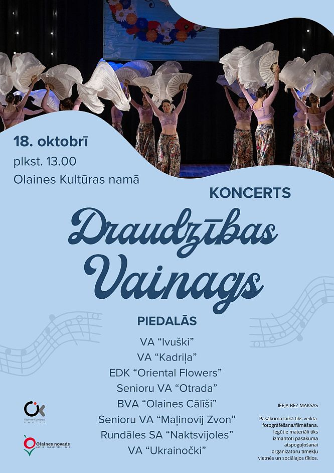 18.oktobrī plkst.13.00 Olaines Kultūras namā notiks koncerts "Draudzības vainags" sadarbībā ar biedrību "Klubs Gamma". Piedalās: vokālie ansambļi “Ivuška”, “Kadriļa” un “Ukrainočki”, senioru vokālie ansambļi “Otrada” un “Maļinovij zvon”, bērnu vokālais ansamblis “Olaines Cālīši”, eksotisko deju kolektīvs “Oriental Fowers” un Rundāles senioru ansamblis “Naktsvijoles”.