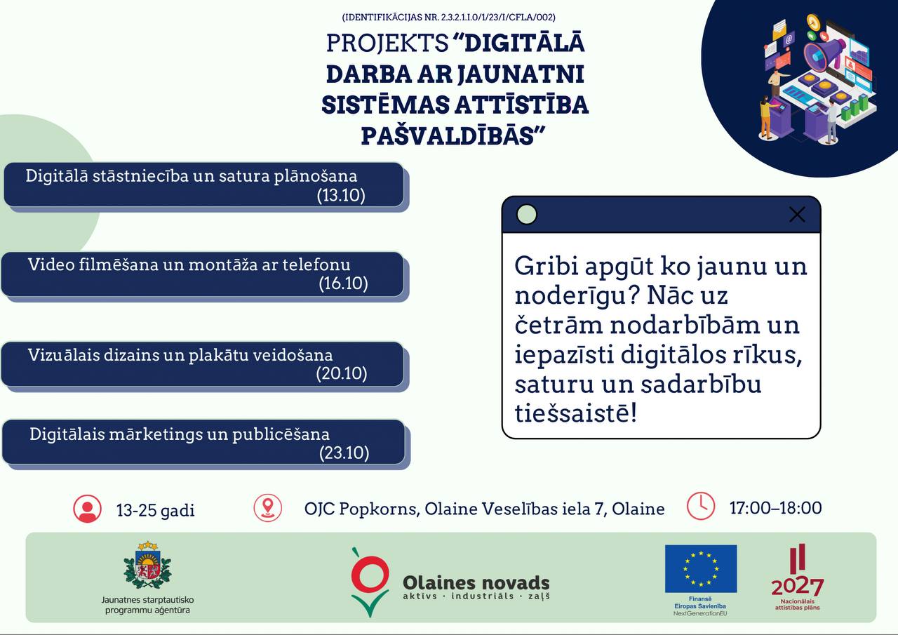 20.oktobrī plkst.17.00 Olaines jauniešu centrā “Popkorns” notiks nodarbību cikla "Digitālā satura veidošanas mācības" trešā nodarbība "Vizuālais dizains uun plakātu veidošana". Būs radošā puse digitālajam saturam – plakātu veidošana un vizuālais dizains. Padari savu saturu vizuāli pievilcīgu!