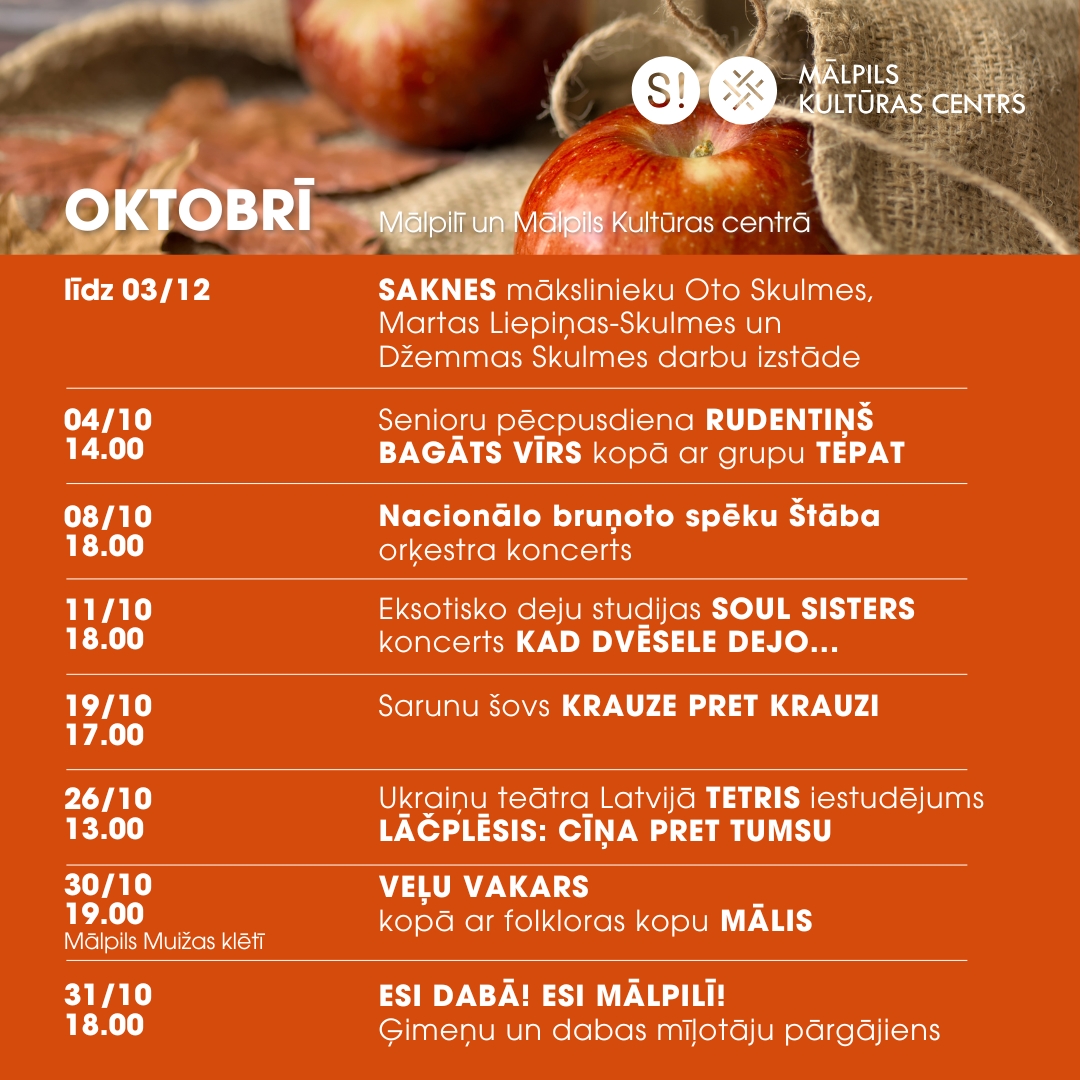 26.oktobrī plkst.13.00 Mālpils Kultūras centrā gaidāms ukraiņu teātra Latvijā "Tetris" iestudējums "Lāčplēsis: cīņa pret tumsu". Izrāde tapusi, balstoties uz latviešu tautas eposa motīviem, kas savīti ar mūsdienu aktualitātēm, veidojot spilgtu dialogu starp pagātni un šodienu. Scenārija autore un režisore – teātra vadītāja Diāna Kačane.
