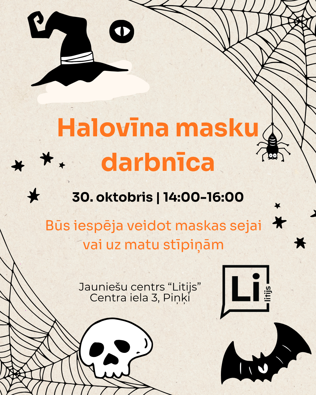 30.oktobrī plkst.14.00–18.00 jauniešu centrā “Litijs” Piņķos notiks Halovīna masku darbnīca. Būs iespēja izgatavot sejas maskas vai arī galvas rotas uz stīpiņām. Kas Halovīnā būsi Tu? Zaķis, velns, sikspārnis vai kas ļoti baiss? Lai vai kas plāno būt, noteikti kādu detaļu varēsi pagatavot “Litijā”.