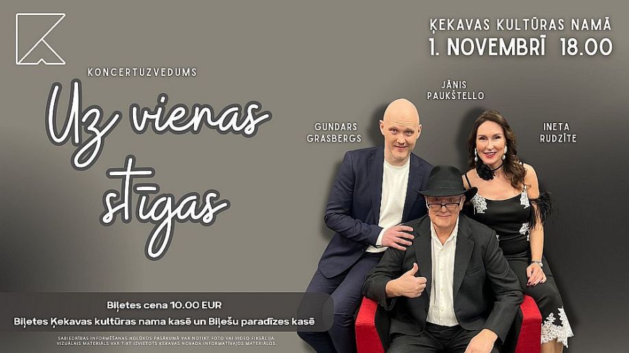 1.novembrī plkst.18.00 Ķekavas Kultūras namā izskanēs koncertuzvedums “Uz vienas stīgas”, kurā apvienojušies izcilie aktieri Jānis Paukštello un Gundars Grasbergs, kā arī šarmantā dziedātāja Ineta Rudzīte. Uzvedumā skan gan Knuta Skujenieka, Imanta Ziedoņa un Jāņa Petera dzeja, gan zināmas un arī mazāk dzirdētas dziesmas no mākslinieku repertuāra: “Ir tāda zeme”, “Vēl, vēl, vēlvienreiz”, “Uz vienas stīgas”, dziesmas no “Ugunīgās Guntas” repertuāra (“Caur vēderu uz sirdi ceļš”, “Ko vēlies tu, ko vēlos es”, “Tu patīc man”) u.c., bet koncerta noslēgumā, protams, Maestro Raimonda Paula un Leona Brieža leģendārā dziesma “Cielaviņa”.