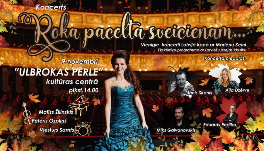9.novembrī plkst.14.00 kultūras centrā "Ulbrokas pērle" notiks koncerts "Roka pacelta sveicienam". Uz kādu laiku Latvijas Nacionālās operas soliste Marlēna Keine teiks savai mīļajai Latvijai: “Uz drīzu tikšanos!”, taču kā skaistu dāvanu viņa atstās šo koncertprogrammu. Tā būs vesela krāsu palete, kurā satiksies mūzika, balss un dzeja, pārvēršot šo muzikālo gleznu par kaut ko patiesi īpašu.