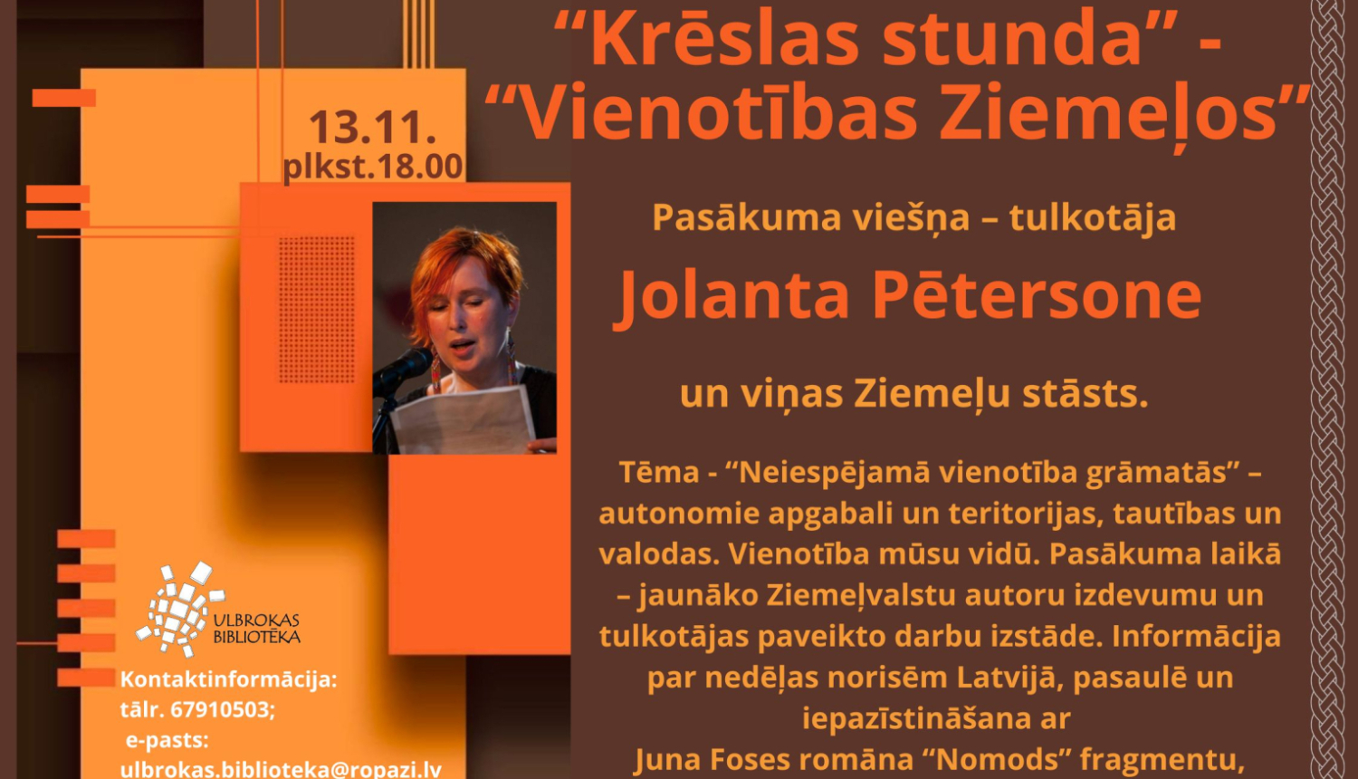 13.novembrī plkst.18.00 Ulbrokas bibliotēkā notiks Ziemeļvalstu literatūras nedēļas pasākums “Krēslas stunda”. Pasākuma viešņa – tulkotāja Jolanta Pētersone un viņas ziemeļu stāsts. Tēma: “Neiespējamā vienotība grāmatās” – autonomie apgabali un teritorijas, tautības un valodas.