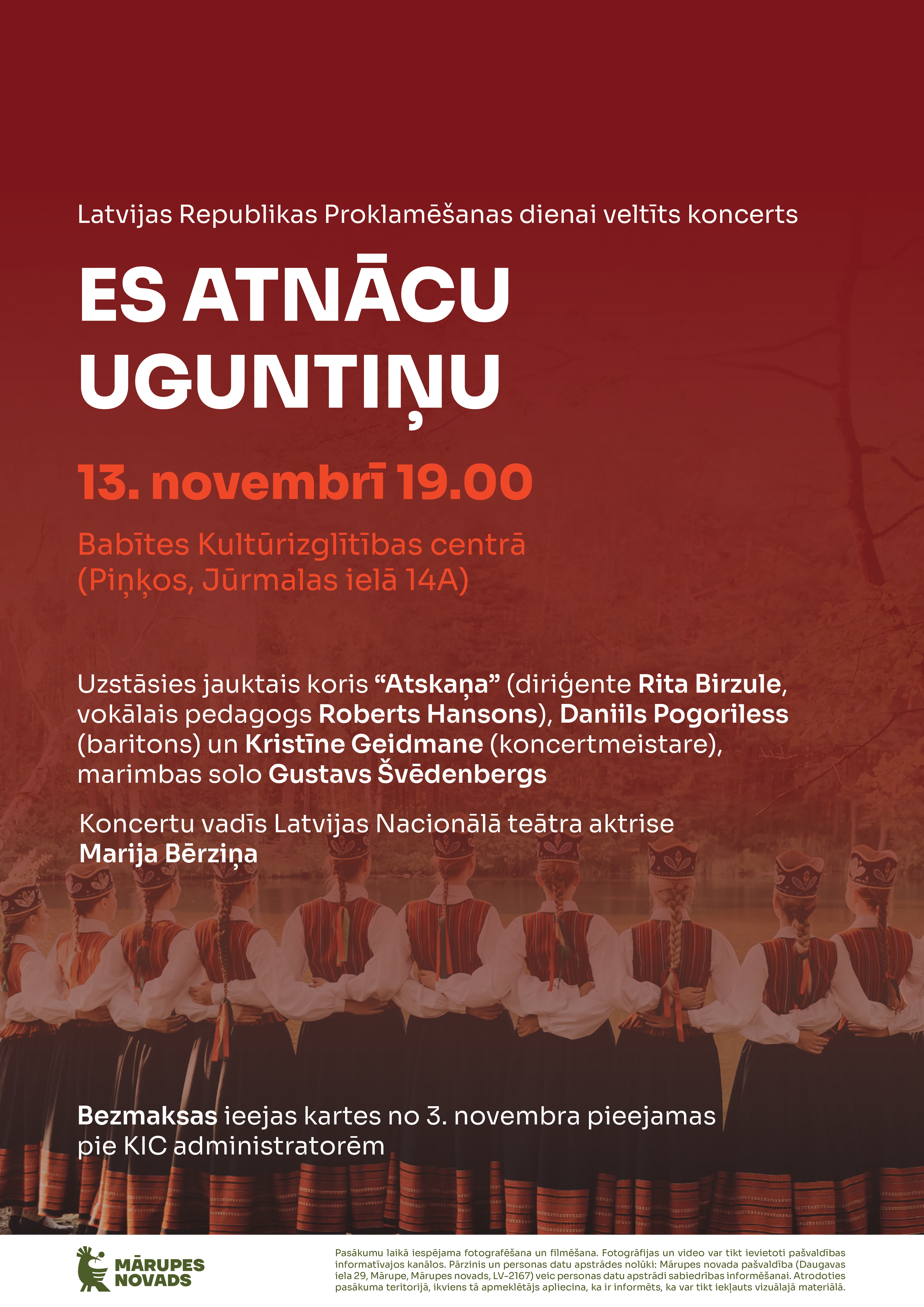 13.novembrī plkst.19.00 Babītes Kultūrizglītības centrā Piņķos notiks Latvijas Republikas Proklamēšanas dienai veltīts koncerts “Es atnācu uguntiņu”. Piedalīsies jauktais koris “Atskaņa” (diriģente Rita Birzule, vokālais pedagogs Roberts Hansons), Daniils Pogoriless (baritons), Kristīne Geidmane (koncertmeistare), marimbas solo - Gustavs Švēdenbergs. Koncertu vadīs Latvijas Nacionālā teātra aktrise Marija Bērziņa.