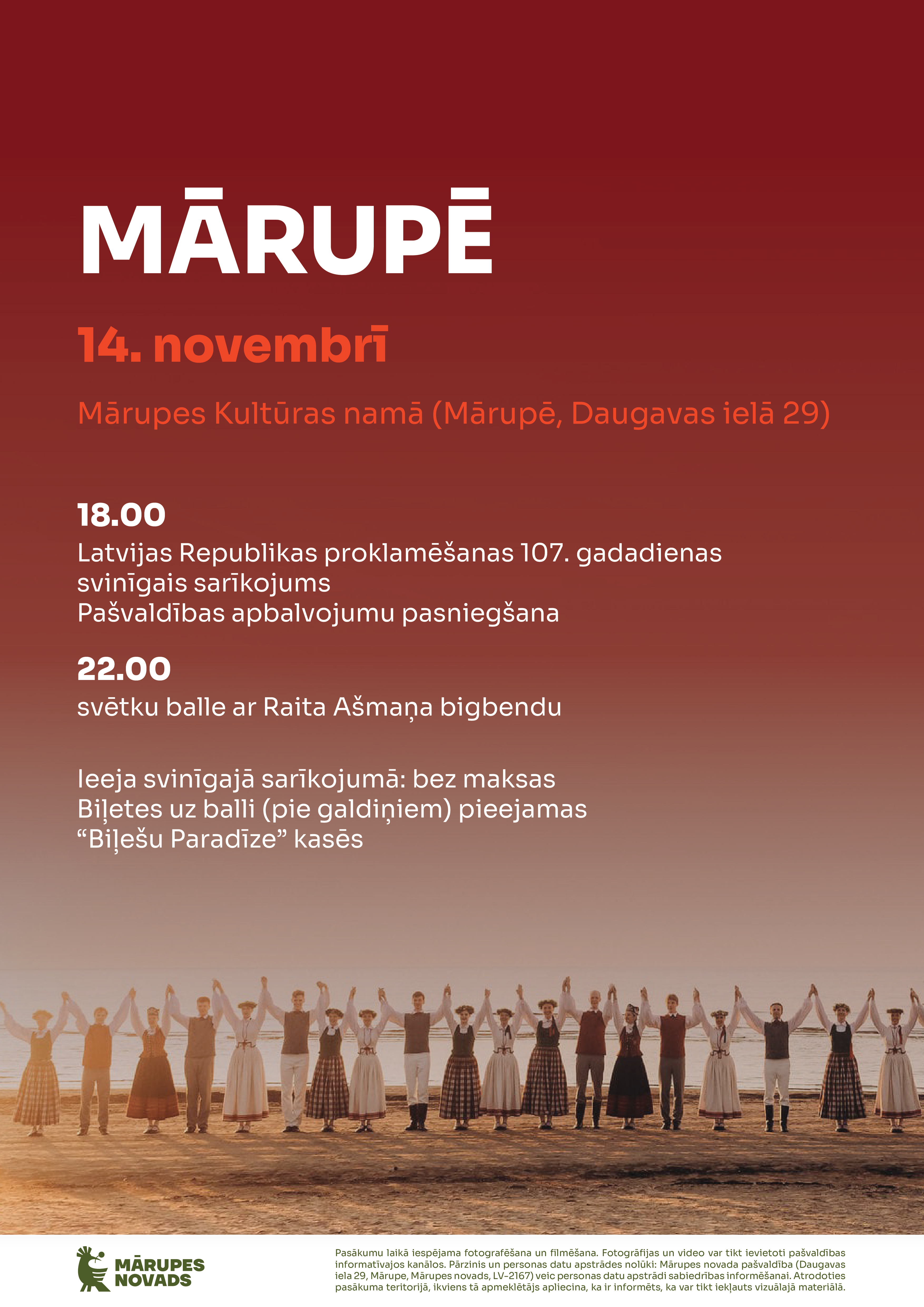 14.novembrī plkst.18.00 Mārupes Kultūras namā notiks Latvijas Republikas proklamēšanas 107.gadadienas svinīgais sarīkojums un pašvaldības apbalvojumu pasniegšana, savukārt plkst.22.00 gaidāma svētku balle ar Raita Ašmaņa bigbendu.