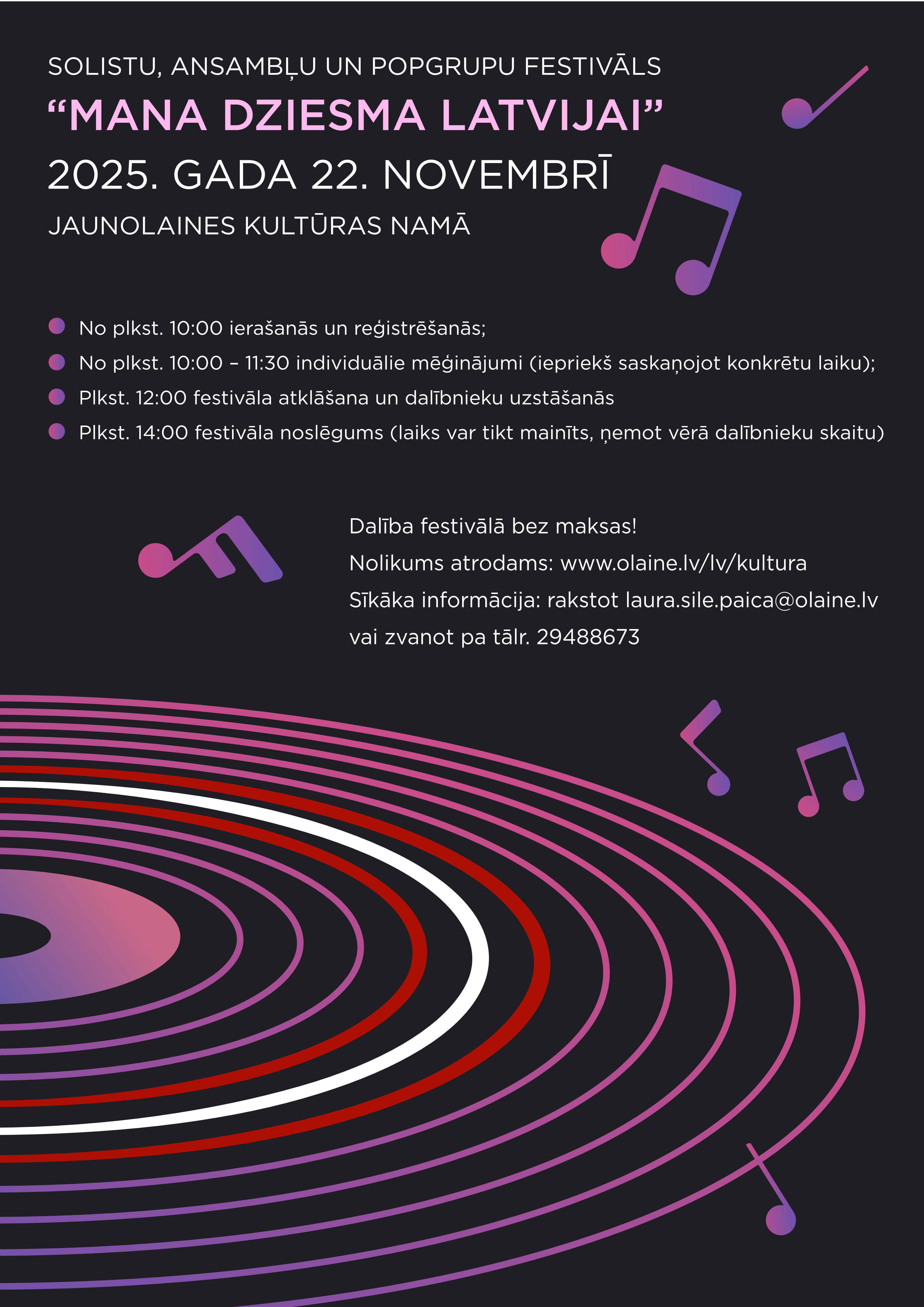 22.novembrī plkst.12.00 Jaunolaines Kultūras namā notiks solistu, ansambļu un popgrupu festivāls "Mana dziesma Latvijai".