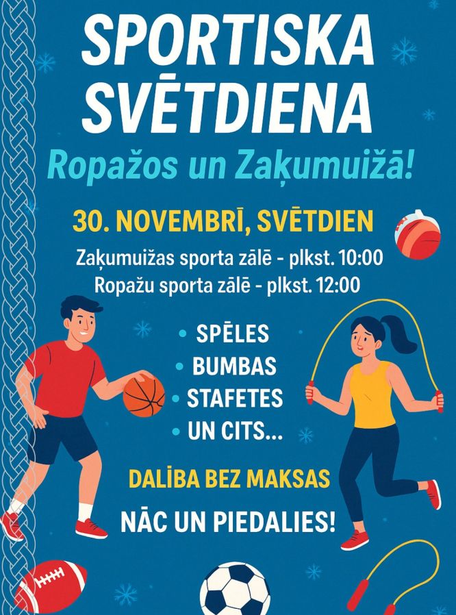 30.novembrī plkst.10.00 Zaķumuižas sporta zālē un plkst.12.00 Ropažu sporta zālē norisināsies sportiskas svētdienas pasākumi: “Aizmirsti par dīvānu un nāc izkustēties kopā ar mums! Tevi gaida spēles, bumbas, stafetes, jautrība un labs noskaņojums — viss, kas vajadzīgs foršai svētdienai. Nav svarīgi, cik ātri skrien vai precīzi met — galvenais ir kustēties un baudīt!”