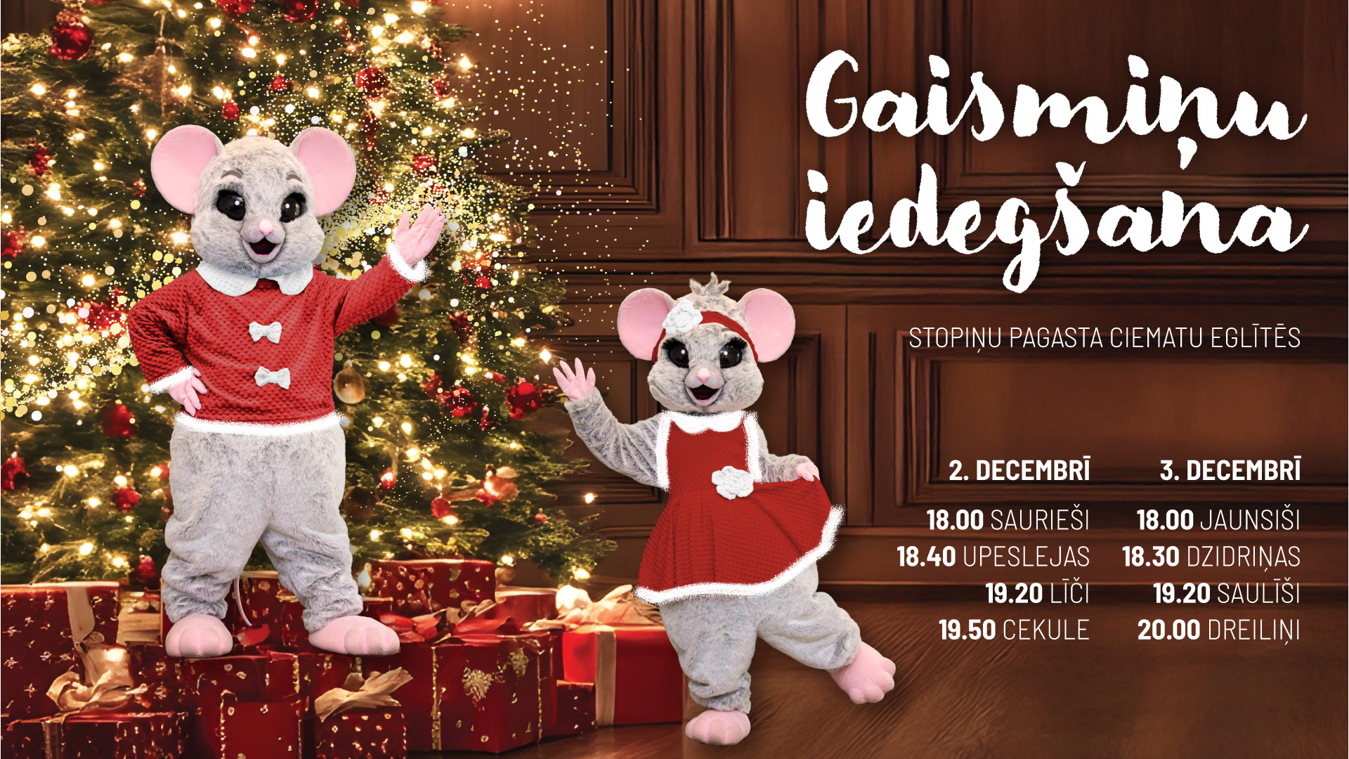 2.decembrī plkst.18.00 Lēdurgā iedegs Ziemassvētku egli kopā ar Labubu un Lapsēnu, savukārt 2. un 3.decembrī gaismiņas svētku eglē iedegs kopā ar jestrajiem pelēniem no radošās apvienības "Pasaku nams": 2.decembrī plkst.18.00 Sauriešos, plkst.18.40 Upeslejās, plkst.19.20 Līčos, plkst.19.50 Cekulē; 3.decembri plkst.18.00 Jaunsišos, plkst.18.30 Dzidriņās, plkst.19.20 Saulīšos, plkst.20.00 Dreiliņos.