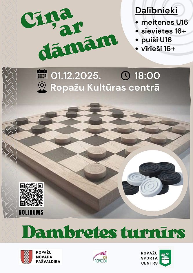 1.decembrī plkst.18.00 Ropažu Kultūras centrā norisināsies 64 lauciņu dambretes turnīrs “Cīņa ar dāmām”. Piedalīties var ikviens Ropažu novadā deklarēts iedzīvotājs un novada izglītības iestāžu audzēkņi. Sacensības notiek pēc četrās grupās atsevišķi zēnu, meiteņu (2010.g.dz.un jaunāki), sieviešu un vīriešu konkurencē. Sacensību izspēles kārtību tiek noteikta atkarībā no dalībnieku skaita.