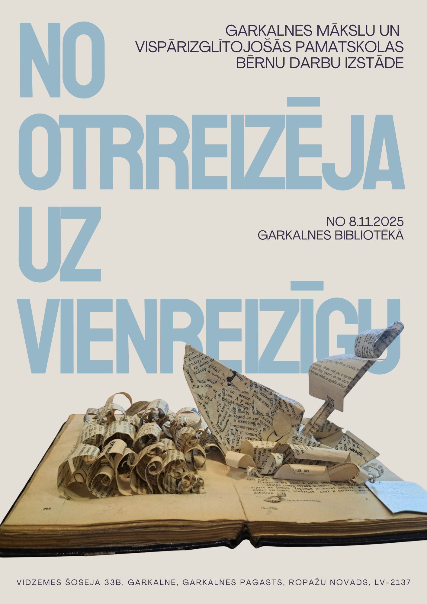 8.decembrī plkst.16.30 Garkalnes bibliotēkā notiks Garkalnes Mākslas un vispārizglītojošās pamatskolas audzēkņu darbu izstādes "No otrreizēja uz vienreizīgu" atklāšana. Izstāde apskatāma līdz 31.decembrim bibliotēkas darba laikā.