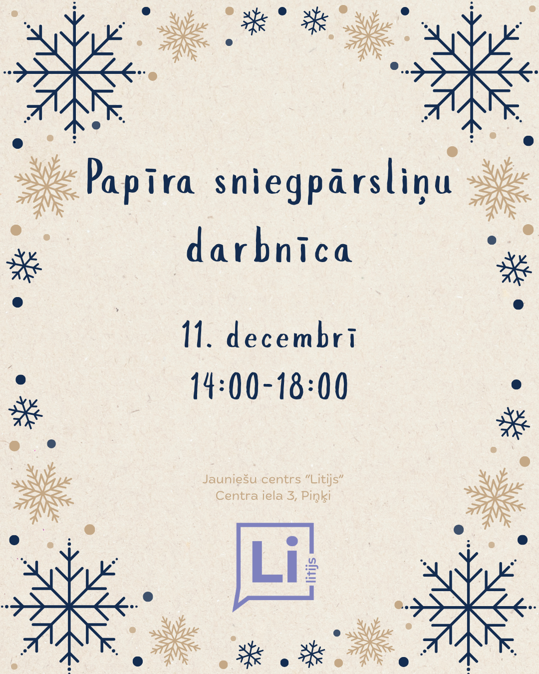 11.decembrī plkst.14.00–18.00 jauniešu centrā “Litijs” Piņķos notiks papīra sniegpārsliņu darbnīca. Vai zināji, ka no papīra var izgriezt gan pavisam vienkāršas, gan ļoti sarežģītas sniegpārsliņas? Nāc un izmēģini dažādas sarežģītības pakāpes sniegpārsliņas, ar kurām varēsi izrotāt savas mājas logus!