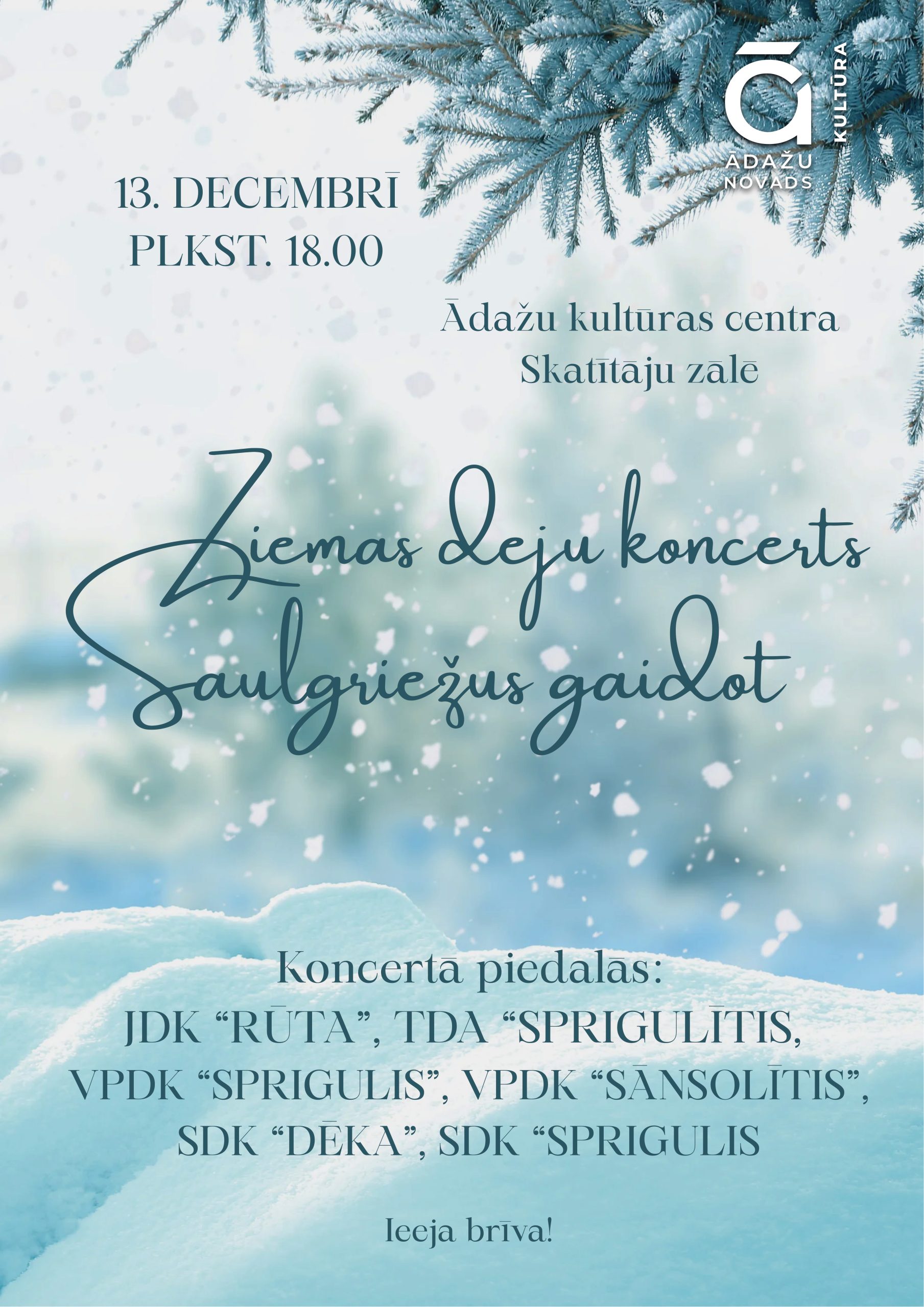 13.decembrī plkst.18.00 Ādažu Kultūras centrā ziemas deju koncerts "Saulgriežus gaidot". Koncertā piedalīsies JDK “Rūta”, TDA “Sprigulītis”, VPDK “Sprigulis”, VPDK “Sānsolītis”, SDK “Dēka”, SDK “Sprigulis”. Ieeja bez maksas.