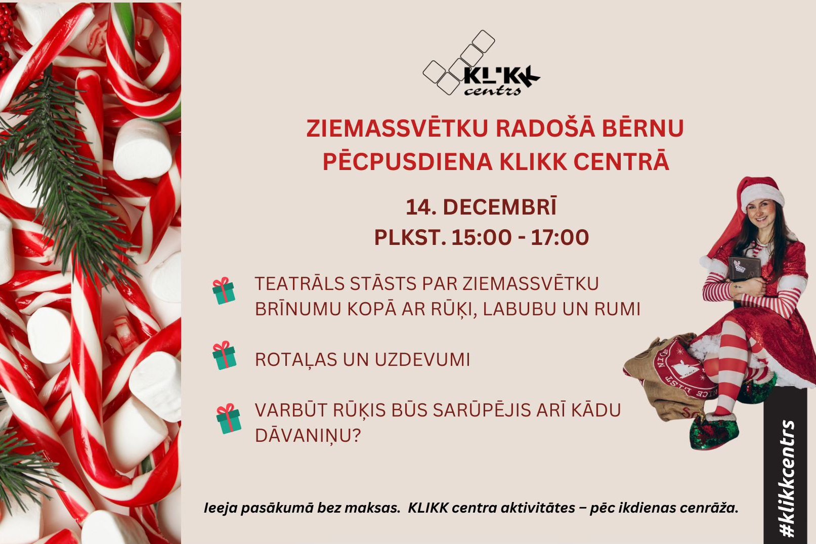 14.decembrī plkst.15.00 "Klikk" centrā Siguldā norisināsies Ziemassvētku radošā bērnu pēcpusdiena, kurā kopā ar Rūķi, Labubu un Rumi izstāstīs brīnumainu Ziemassvētku stāstu, nodosies rotaļām un kopā jauki un jautri pavadīs laiku Ziemassvētku noskaņās.