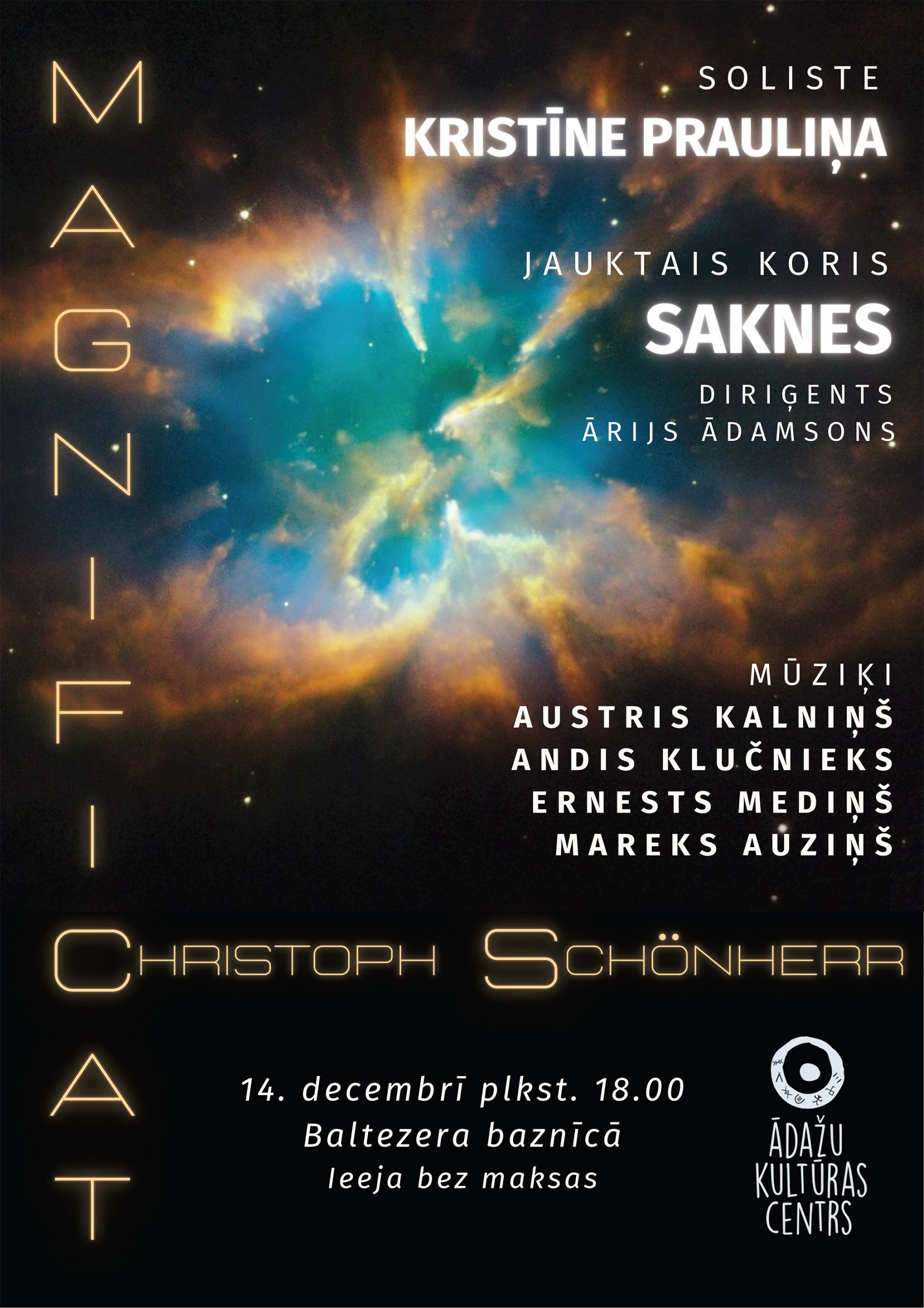14.decembrī plkst.18.00 Baltezera baznīcā Ādažu jauktais koris "Saknes" aicina uz Trešās adventes koncertu, kurā tiks atskaņots vācu komponista Kristofa Šonhera "Magnificat" (2005). Koncertā piedalīsies arī soliste Kristīne Prauliņa, pianists Austris Kalniņš, flautists Andis Klučnieks, sitaminstrumentālists Ernests Mediņš un basģitārists Mareks Auziņš. Ieeja bez maksas.
