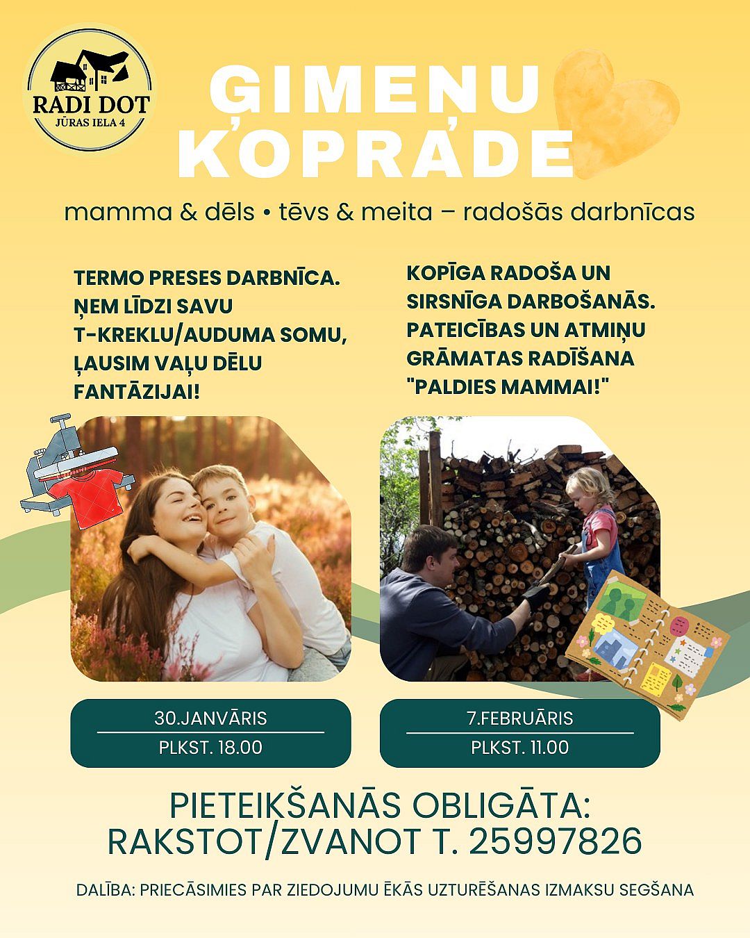 30.janvārī plkst.18.00 Koprades mājā Carnikavā notiks radoša darbošanās ar termopresi mammām ar dēliem – iespēja kopā radīt unikālu apdruku. Visi materiāli tiks nodrošināti, izņemot savu T-kreklu vai auduma somu, ko vēlēsieties apdrukāt. Darbnīcu vadīs rotaļu telpas idejas autore Liene.