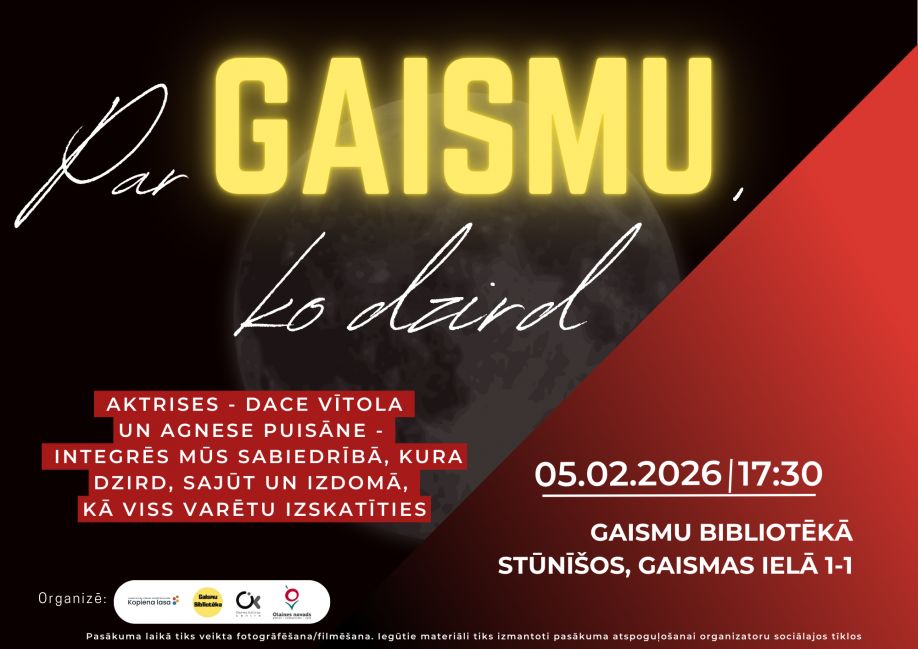 5.februārī plkst.17.30 Gaismu bibliotēkā notiks pasākums "Par gaismu, ko dzird" - tikšanās ar aktrisēm Daci Vītolu un Agnesi Puisāni. Ieeja brīva.