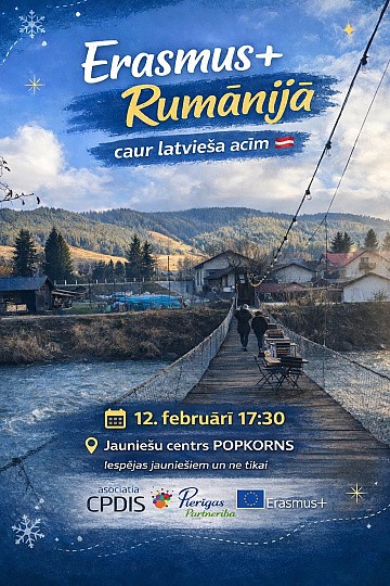 12.februārī plkst.17.30 jauniešu centrs "Popkorns" Olainē aicina piedalīties pasākumā "Erasmus+ Rumānijā caur latvieša acīm", kurā tiks stāstīta personīga pieredze par dalību "Erasmus+" jauniešu projektā Rumānijā. Jaunieši godīgi pastāstīs, kas bija forši, kas izaicinoši un kā jaunieši var iesaistīties nākamajos "Erasmus+" projektos. Pasākums ir īpaši piemērots jauniešiem, kuri interesējas par ceļošanu, jaunām pieredzēm un "Erasmus+" iespējām.
