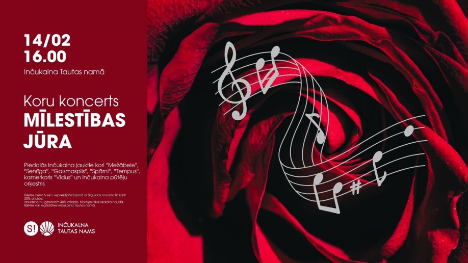 14.februārī plkst.16.00 Inčukalna Tautas namā aicina uz ikgadējo jauktā kora “Mežābele” un draugu koncertu “Mīlestības jūra”. Ļaujies skaistām emocijām, sirsnīgai mūzikai un kopdziedāšanai! Koncertā iedalīsies jauktie kori “Mežābele”, “Senrīga”, “Gaismaspils”, “Spārni”, “Tempus”, kamerkoris “Vidus” un Inčukalna pūtēju orķestris.