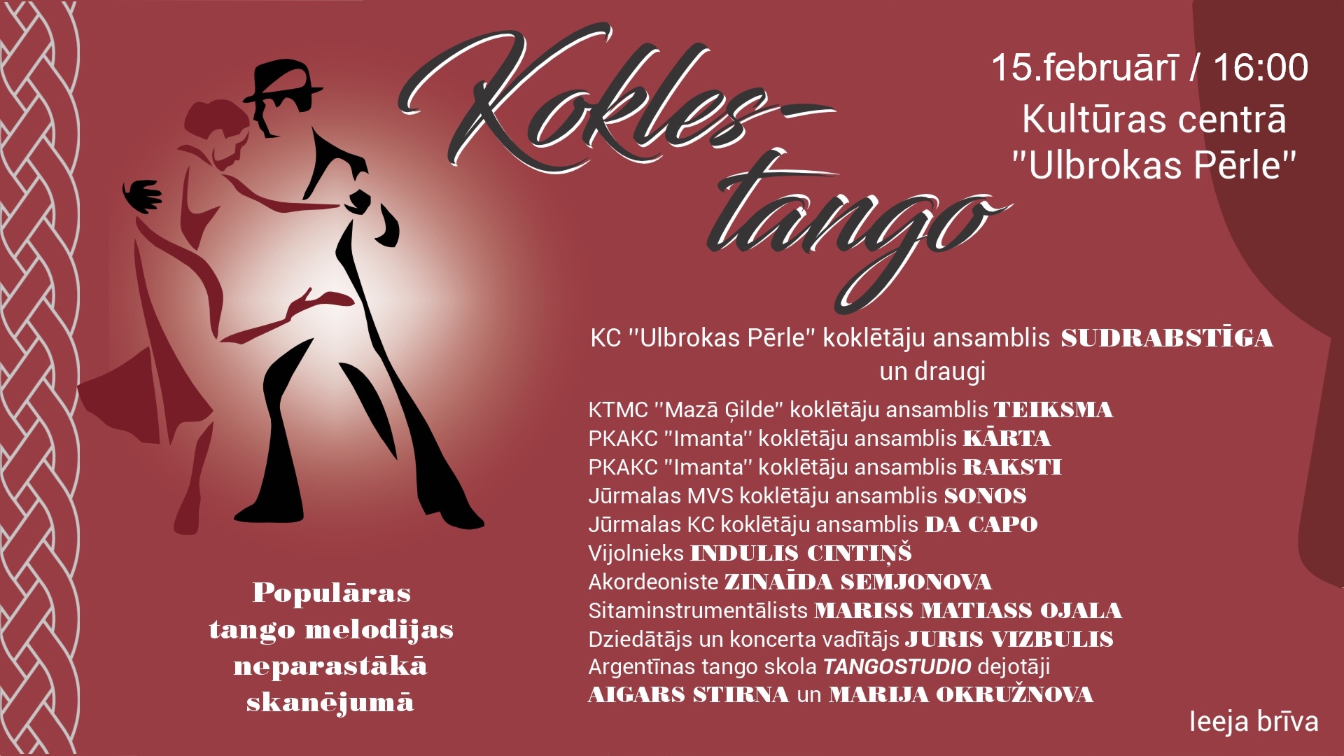 15.februārī plkst.16.00 kultūras centrā "Ulbrokas pērle" gaidāms īpašs bezmaksas koncerts “Kokles–tango”, kurā savijas Argentīnas, Brazīlijas, Francijas, Somijas un Latvijas komponistu tango stāsti, izskanot neparastā un aizraujošā skanējumā – kokļu ansambļu aranžijās kopā ar vijoli, akordeonu, sitaminstrumentiem un balsi. Īpašu noskaņu piešķirs tango dejas, kuras izdejos Argentīnas tango studijas “Tangostudio” dejotāji.