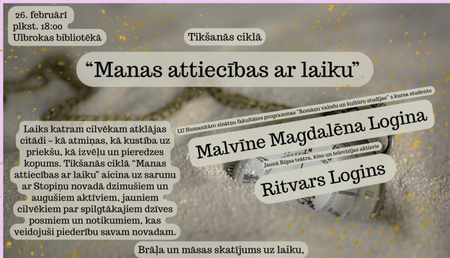 26.februārī plkst.18.00 Ulbrokas bibliotēkā norisināsies cikla "Manas attiecības ar laiku" tikšanās. Šoreiz piedalīsies Stopiņu pagasta iedzīvotāji, brālis un māsa, – Jaunā Rīgas teātra un kino aktieris Ritvars Logins un Latvijas Universitātes romāņu valodu un kultūru studente Malvīne Magdalēna Logina.