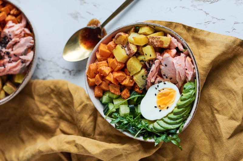 Sastāvdaļas (4-6 personām): 400-450 g laša filejas ar ādu, 4 nelieli kartupeļi, 4 nelieli burkāni, 2 ēdamk. olīveļļas, 1 ķiplokspiedē izspiesta ķiploka daiviņa, 1 avokado, 2 vārītas olas (var izmantot gan mīksti, gan cieti vārītas), 125 g rukolas lapu, 2 nelieli gurķi, zaļie lociņi un sezama sēkliņas rotāšanai, sāls un melnie pipari.