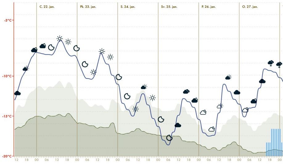 22. janvāris būs šīs nedēļas siltākā diennakts, gaisa temperatūra paaugstināsies līdz -2..-8 grādiem, bet pūtīs mēreni stiprs austrumu vējš, kas radīs sajūtu, ka gaiss ir aukstāks. Vietām nedaudz snigs, vējš šur tur putinās veco sniegu - gaidāms sniegvilksnis.