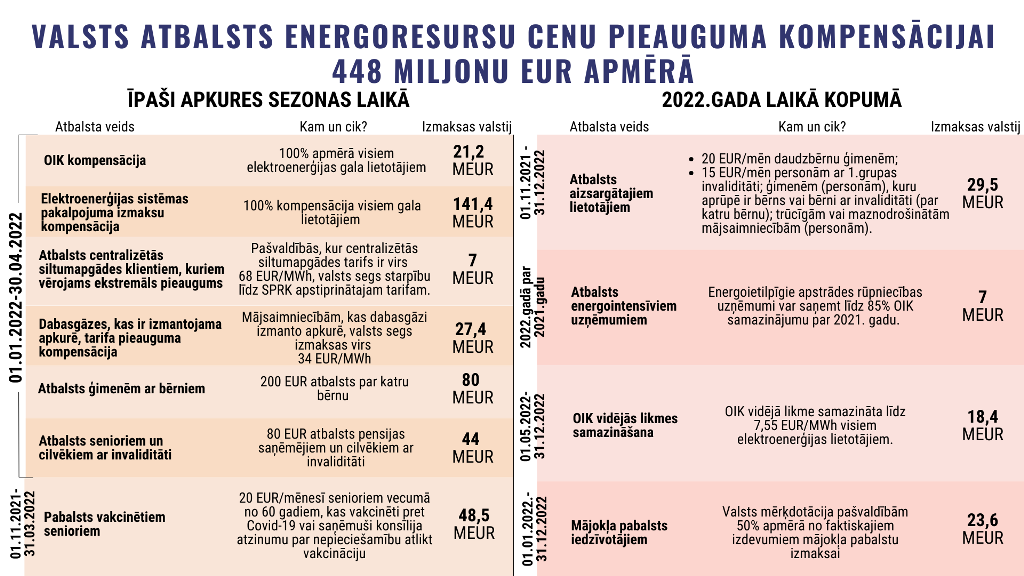 Lai mazinātu energoresursu cenu pieaugama negatīvās sekas visu galalietotāju rēķinos, valsts četrus mēnešus pilnībā segs elektroenerģijas sadales tīkla pakalpojuma izmaksas un OIK izmaksas, ieskaitot pievienotās vērtības nodokli (PVN) visiem elektroenerģijas galalietotājiem, kā rezultātā 860 000 iedzīvotājiem un saimnieciskās darbības veicējiem būs jānorēķinās tikai par elektroenerģijas cenu un tai pievienoto PVN. Sistēmas maksas pilnīga kompensācija sistēmas operatoriem četru mēnešu periodā valstij provizoriski izmaksās 63,5 milj. eiro, savukārt OIK izmaksu segšana – 21,2 milj. eiro, skaidro ministrijas pārstāvji.