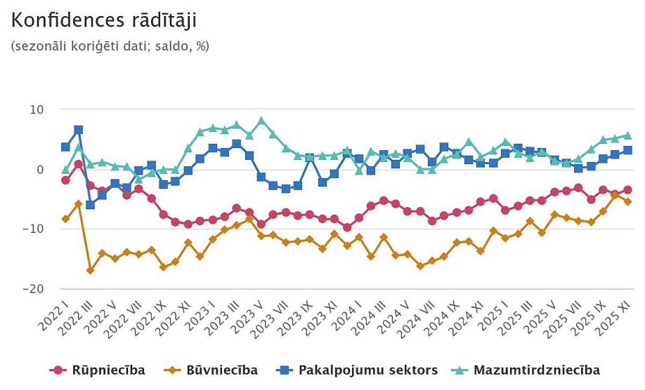 Uzņēmēju noskaņojums 2025. gada novembrī, salīdzinot ar oktobri, uzlabojās apstrādes rūpniecībā, mazumtirdzniecībā un pakalpojumu sektorā, bet pasliktinājās būvniecībā, liecina Centrālās statistikas pārvaldes (CSP) veikto konjunktūras apsekojumu dati. Mazumtirdzniecībā un pakalpojumu sektorā noskaņojums bija pozitīvs, bet apstrādes rūpniecībā un būvniecībā negatīvs.