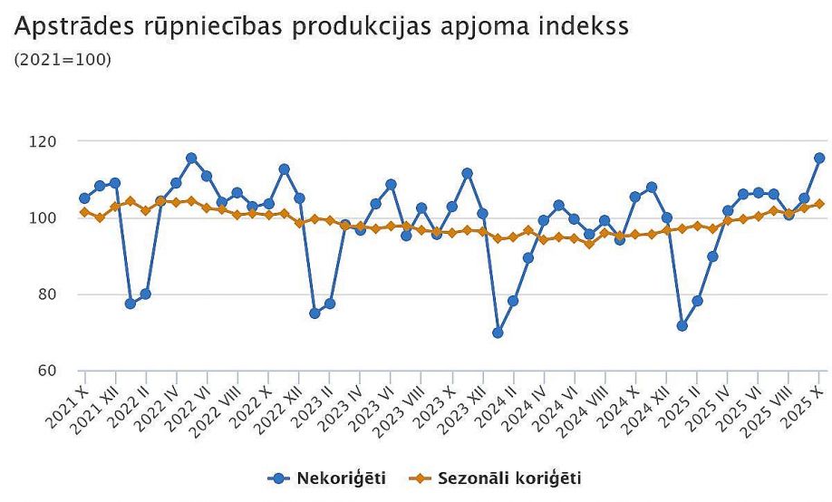 2025.gada oktobrī, salīdzinot ar 2024.gada oktobri, rūpniecības produkcijas apjoms pēc kalendāri koriģētiem datiem salīdzināmajās cenās palielinājās par 8,8 %, liecina Centrālās statistikas pārvaldes (CSP) dati. Ražošanas apjoms palielinājās apstrādes rūpniecībā – par 9,5 % un elektroenerģijas un gāzes apgādē – par 10,1 %, savukārt samazinājās ieguves rūpniecībā un karjeru izstrādē – par 16,1 %.