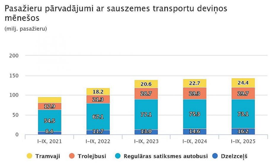 Turpina pieaugt pasažieru pārvadājumi ar vilcieniem, tramvajiem un trolejbusiem, kā arī ar lidmašīnām un prāmjiem, liecina Centrālās statistikas pārvaldes (CSP) dati par 2025. gada pirmajiem deviņiem mēnešiem salīdzinājumā ar attiecīgo periodu 2024. gadā. Vienlaikus dati rāda, ka samazinājušies pārvadājumi ar regulāras satiksmes autobusiem.
