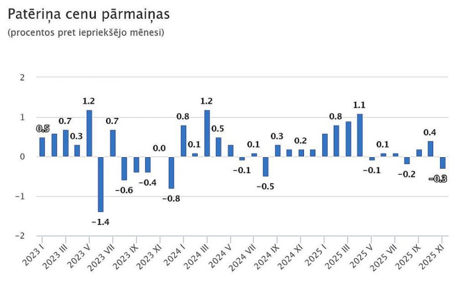2025.gada novembrī, salīdzinot ar oktobri, vidējais patēriņa cenu līmenis samazinājās par 0,3 %, liecina Centrālās statistikas pārvaldes (CSP) dati. Būtiskākā ietekme uz cenu kritumu bija ar transportu saistītām precēm un pakalpojumiem, galvenokārt pasažieru aviopārvadājumiem. Cenas samazinājās pārtikai un bezalkoholiskajiem dzērieniem, lētākai kļūstot kafijai, svaigiem augļiem, sieram un biezpienam, augļu un dārzeņu sulām, pienam, mājputnu gaļai.