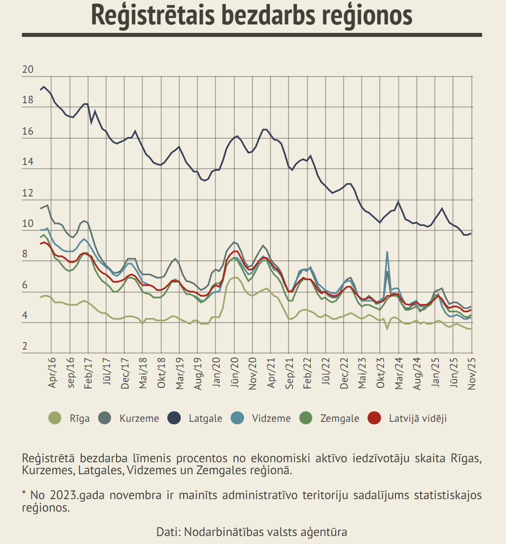 Zemākais reģistrētā bezdarba līmenis novembra beigās joprojām bija Rīgas reģionā - 3,6% no ekonomiski aktīvo iedzīvotāju skaita, kas ir tikpat, cik mēnesi iepriekš, bet augstākais reģistrētā bezdarba līmenis saglabājās Latgales reģionā - 9,8%, kas ir par 0,1 procentpunktu vairāk nekā mēnesi iepriekš.