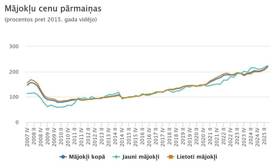 Salīdzinot ar 2015. gadu, mājokļu cenas 2025. gada trešajā ceturksnī bija par 120,7 % augstākas. Jauniem mājokļiem cenas pieauga par 123,9 %, bet lietotiem mājokļiem – par 118,5 %, informēja CSP.