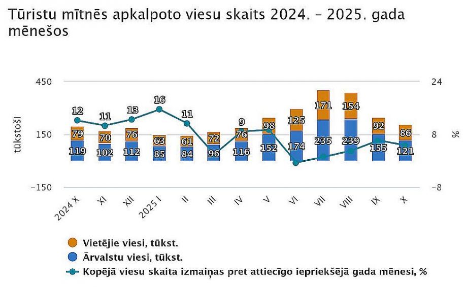 2025.gada oktobrī Latvijas tūristu mītnēs apkalpoti 206,8 tūkstoši ārvalstu un vietējo viesu, veidojot 4,7 % pieaugumu pret 2024. gada oktobri. Viesi tūristu mītnēs pavadīja 367,4 tūkstošus nakšu, kas ir par 6,5 % vairāk nekā iepriekšējā gada oktobrī, liecina Centrālās statistikas pārvaldes (CSP) dati, kas apkopoti no tūrisma nozares pārstāvju sniegtās ikmēneša informācijas par tūristu mītņu darbību.