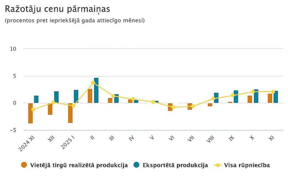 Vietējā tirgū realizētajai produkcijai cenu līmenis 2025. gada novembrī, salīdzinot ar 2024. gada novembri, palielinājās par 1,8 %, eksportētajai produkcijai – par 2,3 %. Eksportam uz eirozonas valstīm cenas pieauga par 3,8 %, eksportam uz valstīm ārpus eirozonas – par 1,0 %.