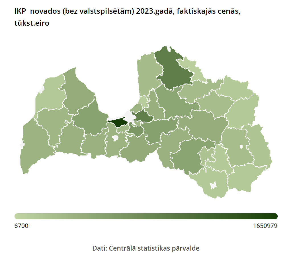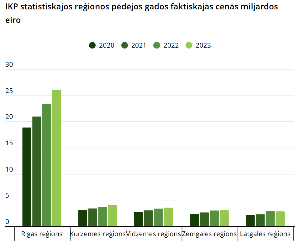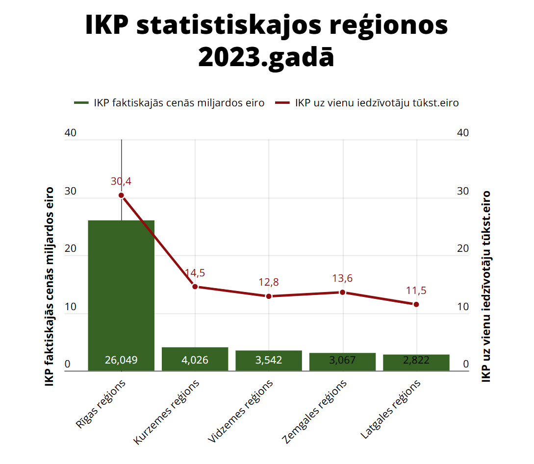 Statistikas pārvaldē norāda, ka Latvijas IKP faktiskajās cenās 2023. gadā bija 39,564 miljardi eiro, tostarp 65,8% jeb 26,049 miljardi eiro no Latvijas IKP bija attiecināmi uz Rīgu un Rīgas reģionu. Sekoja Kurzeme, nodrošinot 10,2% jeb 4,026 miljardus eiro, Vidzeme ar 9% jeb 3,542 miljardiem eiro, Zemgale ar 7,8% jeb 3,067 miljardiem eiro un Latgale ar 7,1% jeb 2,822 miljardiem eiro.