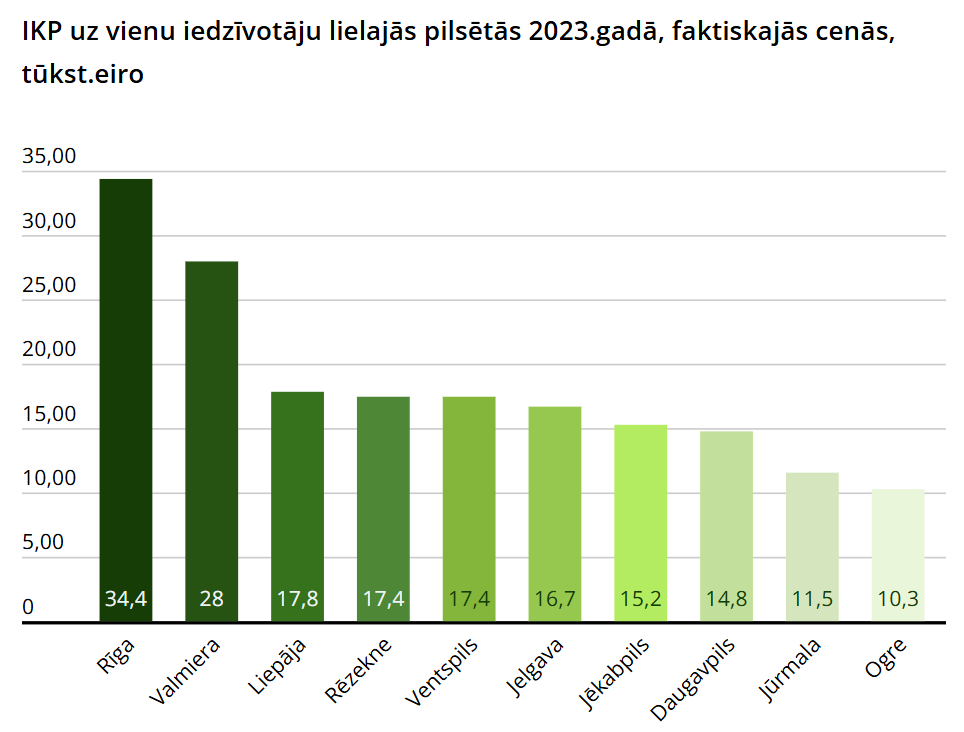 2023. gadā starp valstspilsētām vislielākais IKP uz vienu iedzīvotāju - 34 400 eiro - bija Rīgā, otrajā vietā bija Valmiera ar 28 000, bet trešajā vietā bija Liepāja ar 17 800 eiro. Seko Rēzekne un Ventspils ar 17 400 eiro, Jelgava ar 16 700 eiro, Jēkabpils ar 15 200 eiro, Daugavpils ar 14 800 eiro, Jūrmala ar 11 500 eiro un Ogre ar 10 300 eiro uz vienu iedzīvotāju.