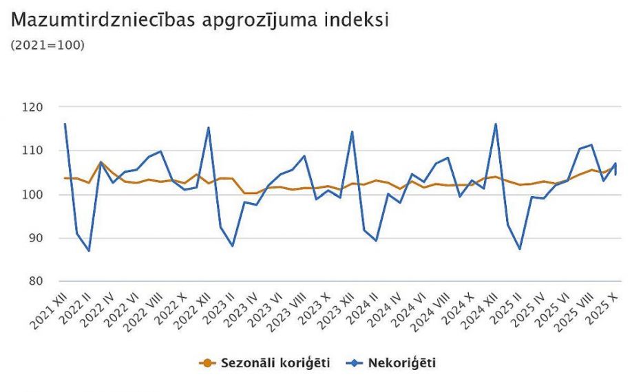 2025.gada novembrī, salīdzinot ar 2024.gada novembri, mazumtirdzniecības apgrozījums pieauga par 3,3 %, liecina Centrālās statistikas pārvaldes (CSP) apkopotie kalendāri koriģētie dati salīdzināmajās cenās. Pārtikas preču mazumtirdzniecība pieauga par 0,8 %. Nepārtikas preču mazumtirdzniecības apjoms, neieskaitot autodegvielas mazumtirdzniecību, palielinājās par 4,4 %, savukārt autodegvielas – par 4,6 %.