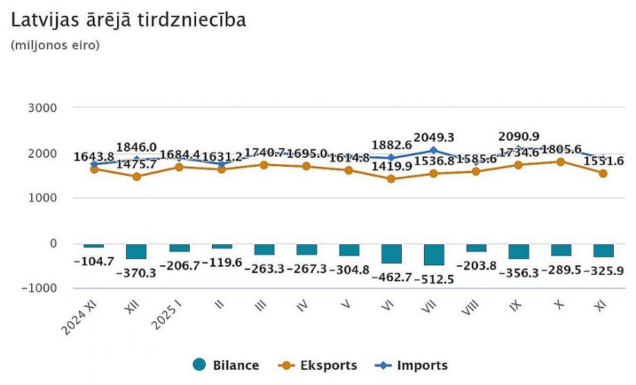 Pagājušā gada vienpadsmit mēnešos Latvijas ārējās tirdzniecības apgrozījums faktiskajās cenās sasniedza 39,31 miljardu eiro – par 2101,7 miljoniem eiro jeb 5,6 % vairāk nekā 2024. gada atbilstošajā periodā. Eksporta vērtība veidoja 18 miljardus eiro (pieaugums par 636,4 milj. eiro jeb 3,7 %), bet importa – 21,31 miljardu eiro (pieaugums par 1465,3 milj. eiro jeb 7,4 %).