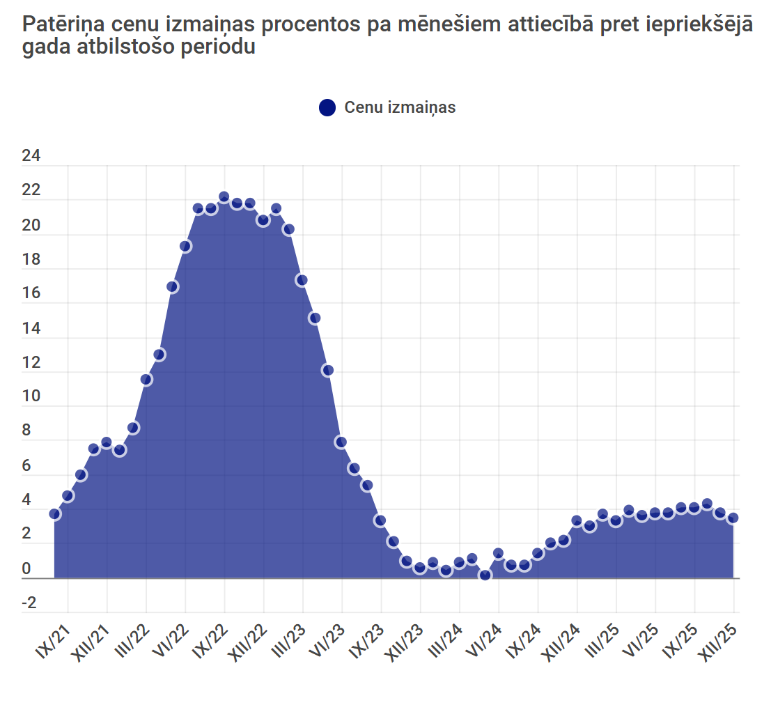 Latvijā gada vidējā inflācija pagājušajā gadā bija 3,7%, aģentūra LETA uzzināja Centrālajā statistikas pārvaldē. Vienlaikus 2025. gada decembrī Latvijā patēriņa cenas, salīdzinot ar novembri, samazinājās par 0,1%, bet gada laikā - 2025. gada decembrī salīdzinājumā ar 2024. gada decembri - patēriņa cenas palielinājās par 3,5%.