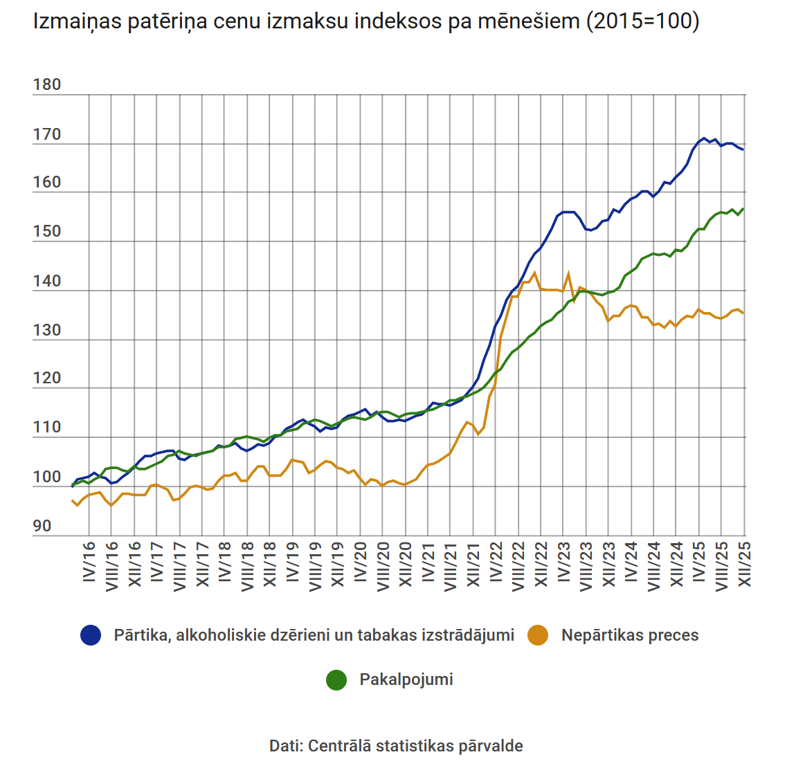Statistikas pārvaldē norāda, ka būtiskākā ietekme uz cenu līmeņa izmaiņām 2025. gada decembrī, salīdzinot ar novembri, bija alkoholiskajiem dzērieniem un tabakas izstrādājumiem (-0,2 procentpunkti), apģērbam un apaviem (-0,1 procentpunkts), veselības aprūpei (-0,1 procentpunkts), kā arī ar transportu saistītām precēm un pakalpojumiem (+0,1 procentpunkts) un ar mājokli saistītām precēm un pakalpojumiem (+0,1 procentpunkts).