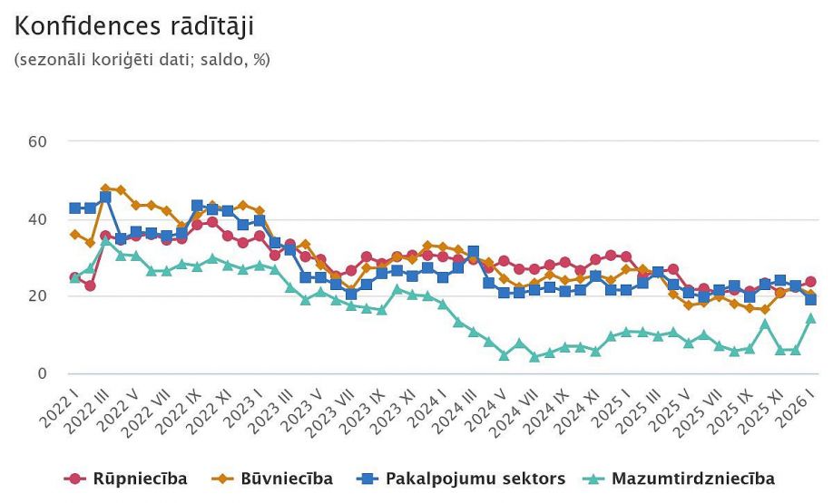 Pēc īslaicīga krituma 2025. gada noslēgumā janvārī konfidences rādītājs mazumtirdzniecībā pēc sezonāli koriģētiem datiem pieaudzis par 0,8 procentpunktiem un sasniedzis vērtību 3,2, vēsta CSP.