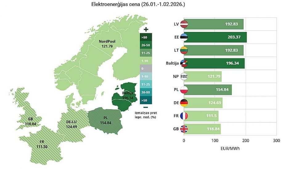 Savukārt Igaunijā vidējā elektroenerģijas cena palielinājās par 30% - līdz 203,37 eiro par MWh.