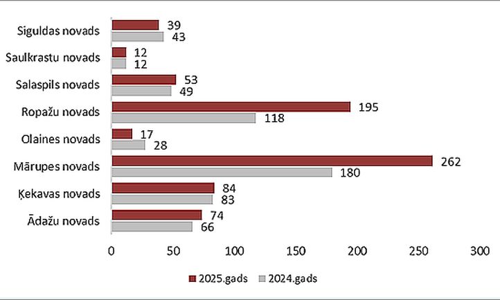 Salīdzinājumā ar 2024. gadu dzīvokļu darījumu skaits 2025. gadā samazinājās Olaines novadā - par 39% un Siguldas novadā - par 9%.